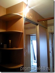 Шкаф- купе имеет открытую секцию полок под различные вещи и антресоль (кстати вместительную и удобную для редко используемых вещей) с распашными дверями ,с помощью которой решено было обыграть трубу отопления,проходящую вверху комнаты.