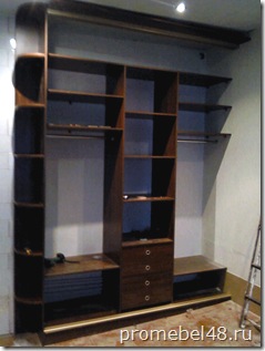 Шкаф состоит из четырёх отделений: открытая секция с радиусными полками , два отделения с полками и вешалами под длинную и короткую одежду и отделение с полками и ящиками .Антресоль во весь шкаф очень вместительна и позволяет хранить негабаритные вещи.